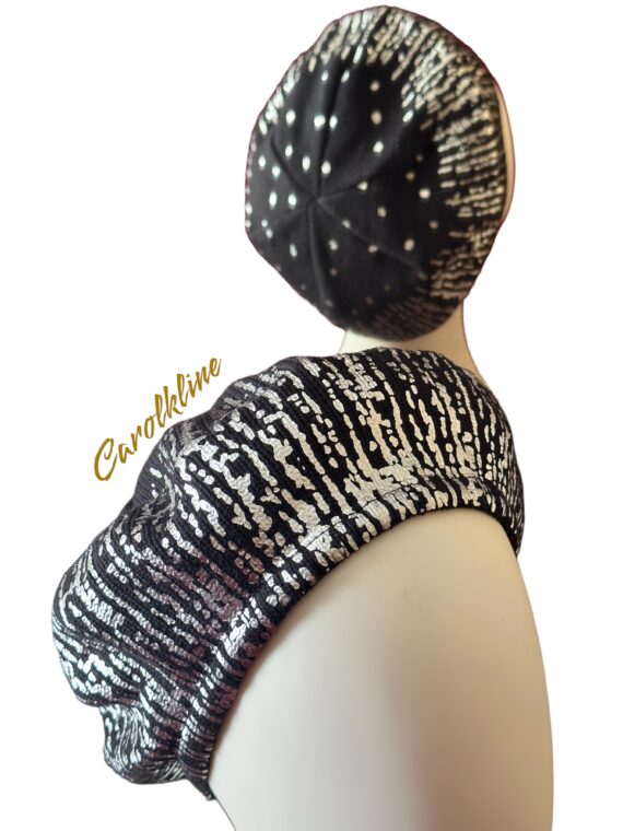 Beret Snood Black Cotton With Metallic Silver Foil (Lined)(Adjustable)
